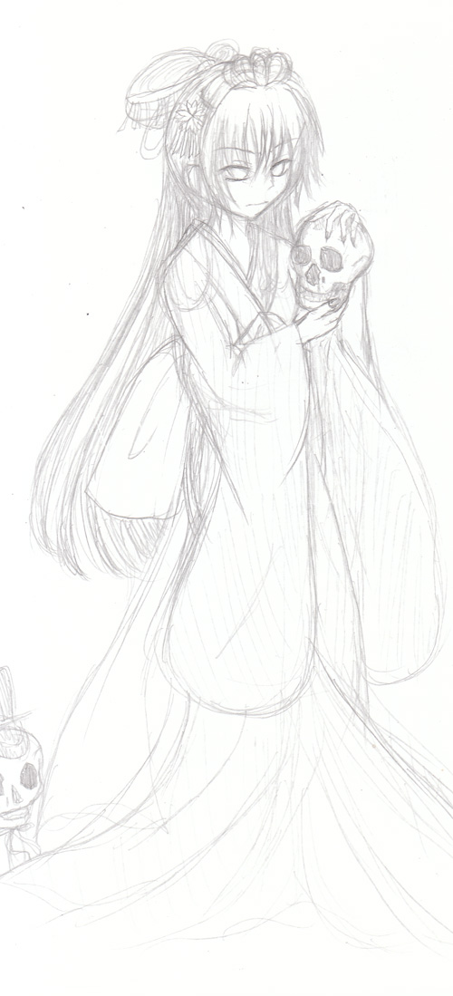 馬に乗って軍旗を持っているとか、鎌を持っているとか色々あるようですが、私の中では河鍋狂斎の地獄太夫イメージで、女性にしました。